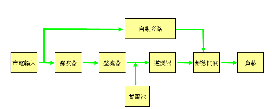 逆變器 ( Inverter )、靜態開關 ( Static Switch )、自動旁路系統 ( Bypass System )、及電池組 ( Battery Bank)等組成。